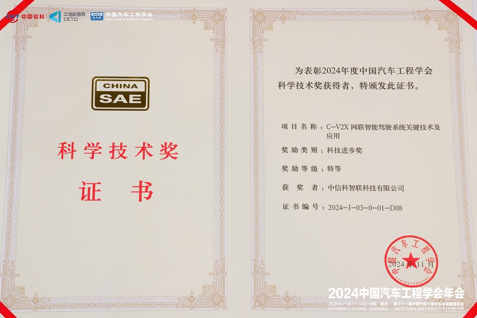 為表彰在推動行業(yè)科技進步中做出杰出貢獻的單位和個人,中國汽車工程學(xué)會同期特別舉辦了首屆中國汽車工程學(xué)會科學(xué)技術(shù)獎勵大會暨高等級獎項技術(shù)分享會。由中國信科集團、中信科智聯(lián)、中汽中心、中國一汽、蔚來汽車、東風(fēng)悅享、北京車網(wǎng)、國汽(北京)智聯(lián)等單位聯(lián)合申報的“C-V2X 網(wǎng)聯(lián)智能駕駛系統(tǒng)關(guān)鍵技術(shù)及應(yīng)用”榮獲2024年度中國汽車工程學(xué)會科學(xué)技術(shù)獎-特等獎,彰顯以上科研團隊為智能網(wǎng)聯(lián)車產(chǎn)業(yè)發(fā)展作出的突出貢獻。此獎不僅是對獲獎?wù)叩臉s譽認(rèn)可,更是對整個行業(yè)創(chuàng)新精神的一次集中展示,激勵著更多科研人員和團隊為汽車科技的進步貢獻力量。