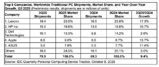 聯(lián)想集團(tuán)蟬聯(lián)全球PC市場(chǎng)份額第一。根據(jù)IDC的最新數(shù)據(jù),2025年第三季度,聯(lián)想的PC出貨量達(dá)到1940萬臺(tái),市場(chǎng)份額高達(dá)25.5%。值得注意的是,聯(lián)想實(shí)現(xiàn)了17.3%的同比增長(zhǎng),這一增速顯著高于市場(chǎng)平均水平(9.4%),也高于所有前五名主要競(jìng)爭(zhēng)對(duì)手。而戴爾在本季度僅實(shí)現(xiàn)了2.6%的增長(zhǎng),市場(chǎng)份額也從去年同期的14.2%下降到13.3%。