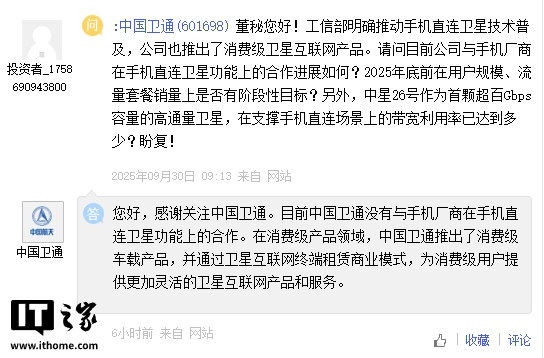 10 月 17 日消息,中國衛(wèi)通今日在投資者互動平臺透露,目前中國衛(wèi)通沒有與手機(jī)廠商在手機(jī)直連衛(wèi)星功能上的合作。在消費(fèi)級產(chǎn)品領(lǐng)域,中國衛(wèi)通推出了消費(fèi)級車載產(chǎn)品,并通過衛(wèi)星互聯(lián)網(wǎng)終端租賃商業(yè)模式,為消費(fèi)級用戶提供更加靈活的衛(wèi)星互聯(lián)網(wǎng)產(chǎn)品和服務(wù)。