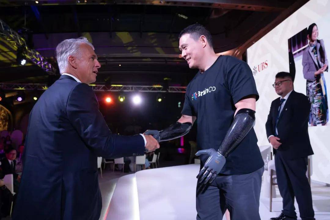 晚宴僅設(shè)兩個主題對話環(huán)節(jié),強腦科技創(chuàng)始人兼CEO 韓璧丞及合伙人何熙昱錦,與諾貝爾經(jīng)濟學(xué)獎得主Sir christopher A. Pissarides 分別進行分享。由瑞銀集團環(huán)球財富管理亞洲區(qū)主席及香港區(qū)行政總裁羅詠詩(Amy Lo)主持的“Up close with BrainCo”對話環(huán)節(jié),聚焦腦機接口技術(shù)的創(chuàng)新與產(chǎn)業(yè)化實踐,韓璧丞與何熙昱錦圍繞非侵入式腦機接口的技術(shù)路徑、全球化布局及未來愿景展開交流。強腦科技研發(fā)測試兼產(chǎn)品體驗官倪敏穿戴智能仿生手登臺表演書法,并在表演結(jié)束后與瑞銀集團全球首席執(zhí)行官Sergio P. Ermotti握手,成為當(dāng)晚最具象征意義的瞬間之一。