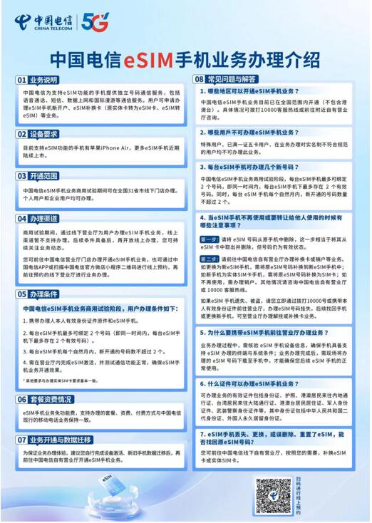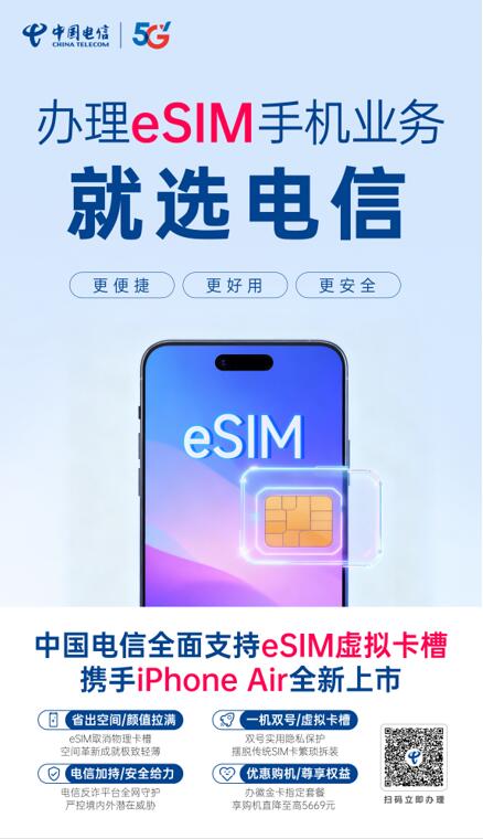 在商用試驗(yàn)期間,安徽電信暫不提供線上辦理渠道。新老用戶只需攜帶支持eSIM功能的手機(jī)及本人身份證,前往安徽電信任自有營業(yè)廳,即可申請辦理eSIM手機(jī)業(yè)務(wù)。目前,蘋果iPhone 17 Air成為首款支持eSIM手機(jī)業(yè)務(wù)的機(jī)型。安徽電信已于2025年10月22日起正式首銷,用戶現(xiàn)場開通即可體驗(yàn)辦理。營業(yè)廳工作人員將提供全程指導(dǎo),幫助用戶完成eSIM功能開通。同時,中國電信APP已同步開放線上預(yù)約。