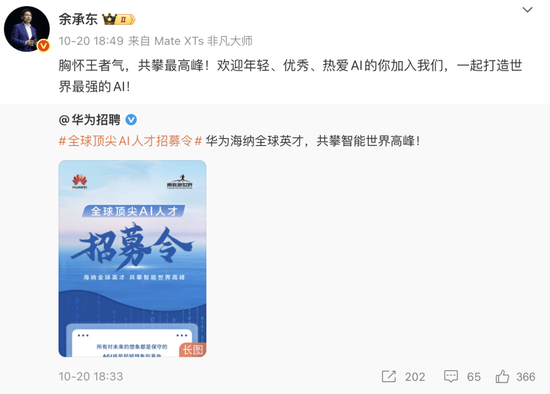 10月20日,華為招聘官微發(fā)布“全球頂尖AI人才招募令”,稱(chēng)正在打造世界一流的AI戰(zhàn)隊(duì),構(gòu)建領(lǐng)先世界的大模型,攀登AGI的巔峰。余承東也在微博轉(zhuǎn)發(fā)該招募令,并表示:“胸懷王者氣,共攀最高峰!歡迎年輕、優(yōu)秀、熱愛(ài)AI的你加入我們,一起打造世界最強(qiáng)的AI!”