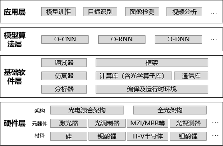 光計(jì)算技術(shù)架構(gòu)包括硬件層、基礎(chǔ)軟件層、模型算法層和應(yīng)用層,整體架構(gòu)和內(nèi)容仍在持續(xù)完善過(guò)程中。