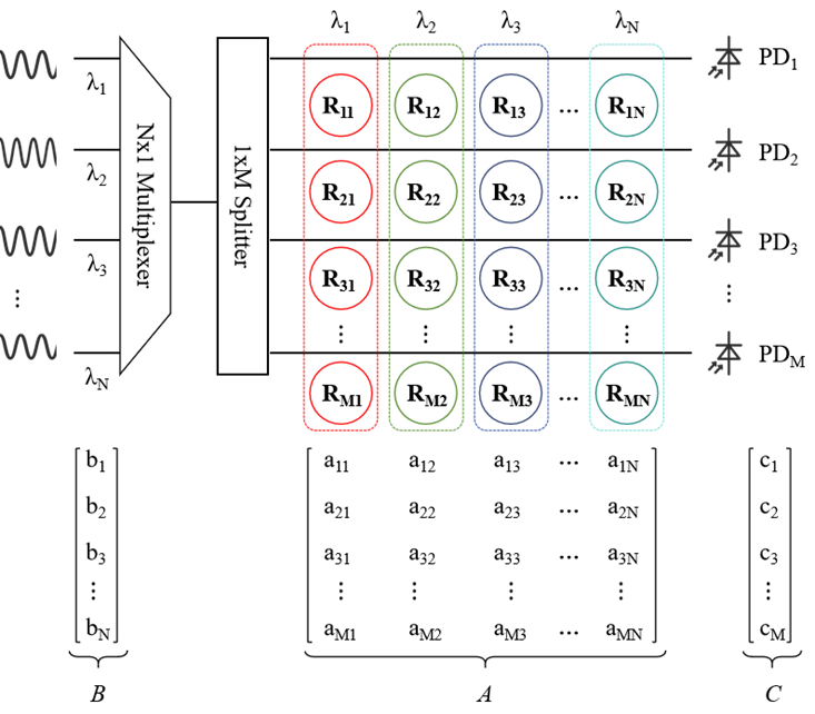 2.基于MRR陣列的矩陣向量乘法:將數(shù)學(xué)上的矩陣與微環(huán)陣列進(jìn)行同構(gòu)映射,依賴于波分復(fù)用(Wavelength Division Multiplexing, WDM)技術(shù),輸入向量中的每個(gè)元素對(duì)應(yīng)于一個(gè)具有特定頻率或波長(zhǎng)的輸入光,然后通過(guò)M×N規(guī)模的光學(xué)權(quán)重矩陣陣列對(duì)其進(jìn)行不同的幅度調(diào)節(jié),從而實(shí)現(xiàn)對(duì)輸入信號(hào)的加權(quán)。