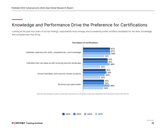 面對持續(xù)存在的人才短缺困境,專業(yè)認(rèn)證的價(jià)值持續(xù)獲得業(yè)界認(rèn)可。89%的IT決策者更傾向于雇用持有專業(yè)認(rèn)證的候選人,認(rèn)為認(rèn)證能有效驗(yàn)證知識儲備(67%)、體現(xiàn)技術(shù)適應(yīng)能力(61%)并證實(shí)對關(guān)鍵工具的熟練度(56%)。然而,與此趨勢相悖的是,企業(yè)對認(rèn)證資助的投入在2024年出現(xiàn)縮減,僅有73%的受訪者表示愿意為員工支付認(rèn)證費(fèi)用,低于2023年的89%。