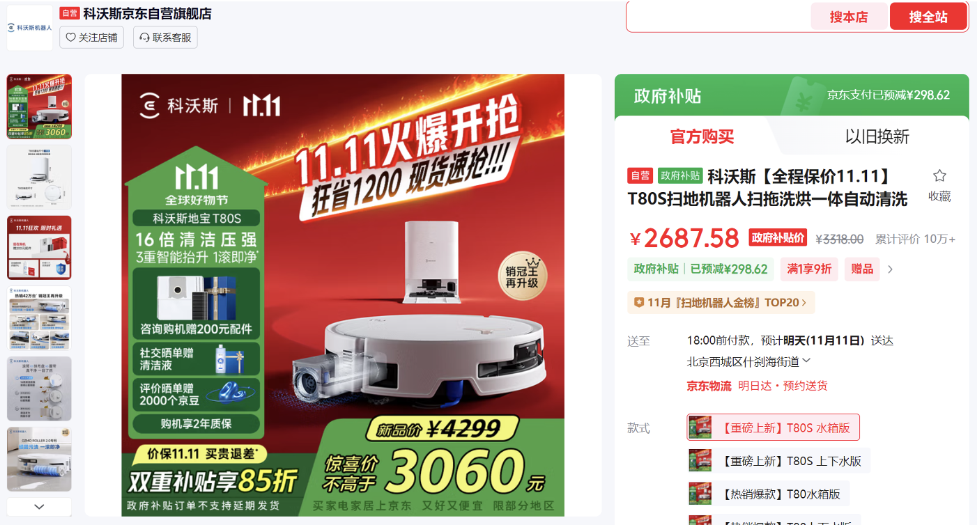 家中不止要除塵更要除污,科沃斯T80S掃地機(jī)器人能一次解決。搭載OZMO ROLLER 2.0恒壓滾筒活水洗地專利,200次/分鐘自清潔,實(shí)時(shí)刮走污水,杜絕以臟拖臟。16倍清潔強(qiáng)壓,干涸醬漬、奶漬一滾即凈。三重智能升降系統(tǒng),自動(dòng)識(shí)別干濕區(qū)與地毯,及時(shí)抬升,避免二次污染;京東11.11下單雙重補(bǔ)貼享85折優(yōu)惠,到手價(jià)2688元。