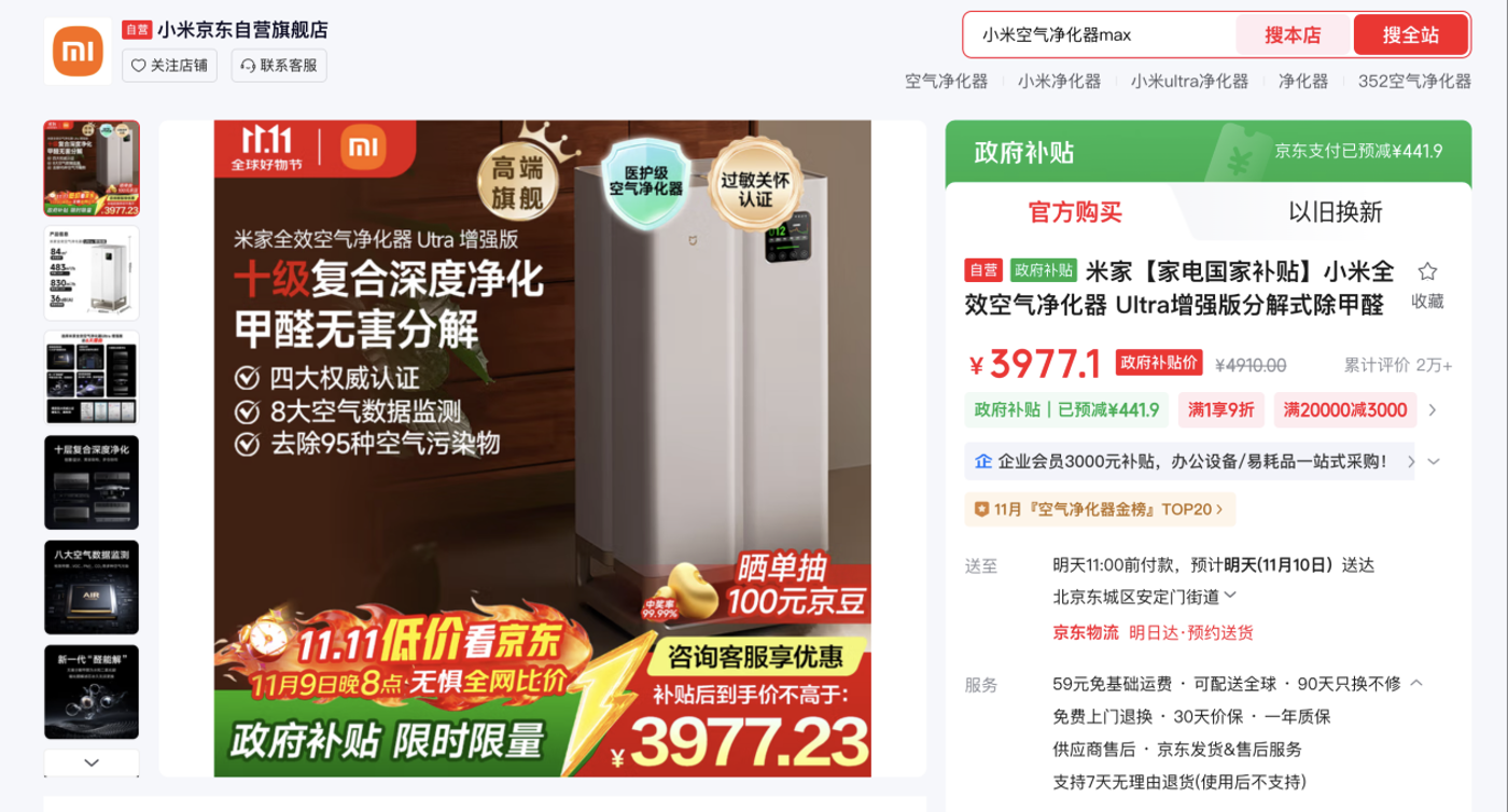 秋冬干燥,空氣中顆粒物增多,呼吸道更需呵護(hù)。小米全效空氣凈化器 Ultra 增強(qiáng)版,創(chuàng)新十級(jí)復(fù)合深度凈化,可有效分解甲醛、二手煙、除細(xì)菌、病毒等95種常見污染物,保持室內(nèi)空氣清新自然。京東11.11期間限時(shí)9折,疊加國家補(bǔ)貼8折,到手價(jià)3977.1元。