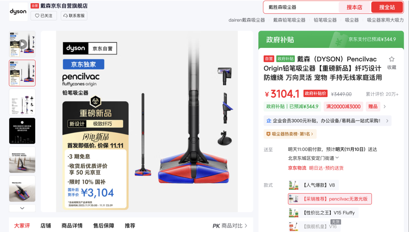 想要及時(shí)省心清潔地面,戴森Pencilvac Origin鉛筆吸塵器少不了。機(jī)身僅38毫米粗細(xì)、0.92kg重量,靈活易用。馬達(dá)轉(zhuǎn)速高達(dá)14萬轉(zhuǎn)/分鐘,除塵率達(dá)99%,四錐萬向吸頭不易纏繞,搭配免打孔磁吸充電底座,收納充電一步到位。京東11.11下單享限時(shí)10%國補(bǔ),到手價(jià)3104.1元。