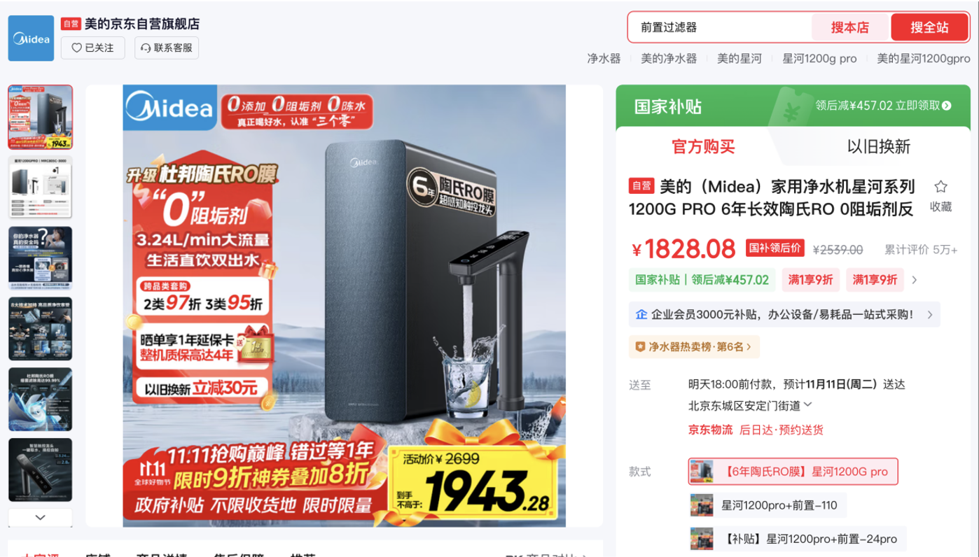 秋冬天氣干燥,喝水頻次增加。美的星河凈水器1200G PRO,智慧觸控龍頭一鍵取水,用水狀態(tài)一目了然。采用杜邦陶氏RO濾芯,出水鮮活,六年長效潔凈,結(jié)合伯努利過濾技術(shù),流速快更耐用。京東11.11期間限時(shí)9折,疊加國家補(bǔ)貼8折,到手價(jià)1828.08元。