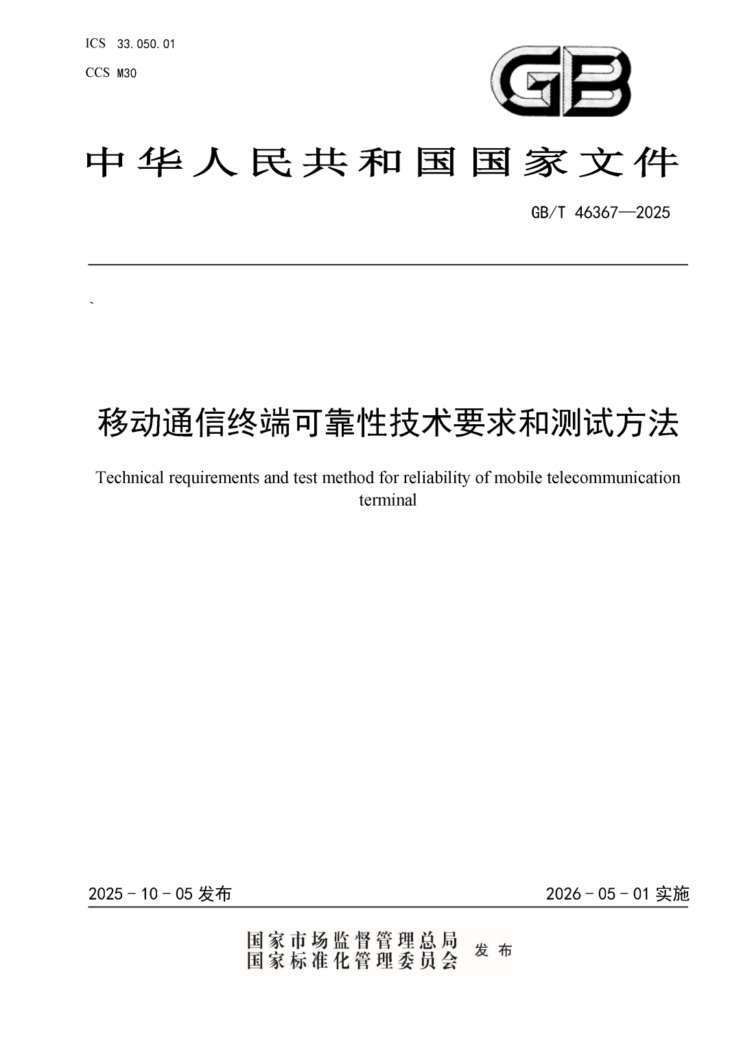11 月 20 日消息,據泰爾終端實驗室今日消息,2025 年 10 月 5 日,由中國信息通信研究院(簡稱“中國信通院”)牽頭制定的移動通信終端可靠性國家標準 GB/T 46367-2025《移動通信終端可靠性技術要求和測試方法》正式發(fā)布,將于 2026 年 5 月 1 日起全面實施。