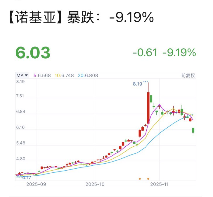 在此前10月份召開的GTC大會上,英偉達CEO黃仁勛宣布以10億美元入股諾基亞并與諾基亞在AI-RAN和6G上開展合作后,諾基亞股價當日大漲超 20%。外界預期很簡單:當 AI 成為全球最強增長引擎,英偉達站在浪潮中心,諾基亞與英偉達合作就意味著站上風口。
