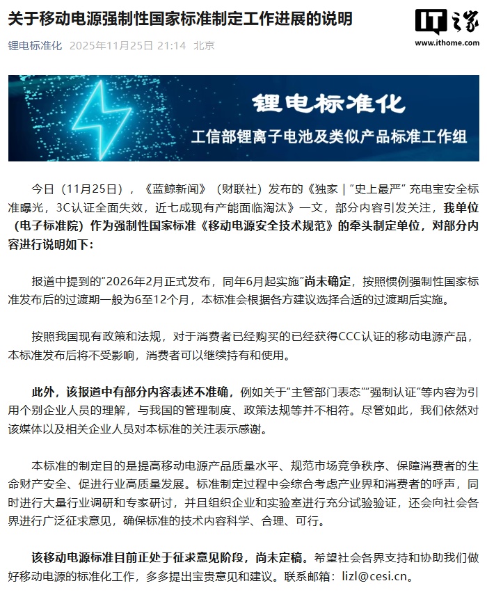 對此,中國電子技術(shù)標準化研究院發(fā)布《關(guān)于移動電源強制性國家標準制定工作進展的說明》稱: