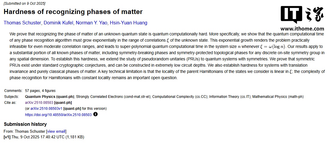 11 月 1 日消息,量子計(jì)算通常被視為破解復(fù)雜問題的關(guān)鍵,但加州理工學(xué)院(Caltech)研究人員發(fā)現(xiàn),即便是最先進(jìn)的量子計(jì)算機(jī)也存在無法求解(或者說需要“無限時(shí)間”才能解出)的問題 —— 識(shí)別未知量子態(tài)的物質(zhì)相 / 相態(tài)(phase of matter)。相關(guān)研究成果已發(fā)表于預(yù)印本平臺(tái) arXiv。