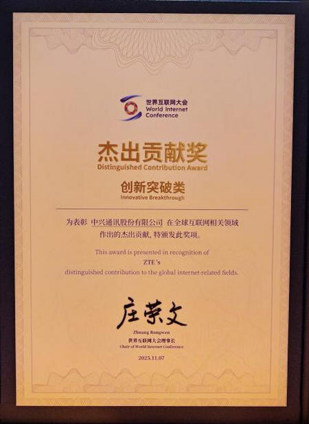 喜報!中興通訊榮獲2025年世界互聯(lián)網(wǎng)大會杰出貢獻(xiàn)獎