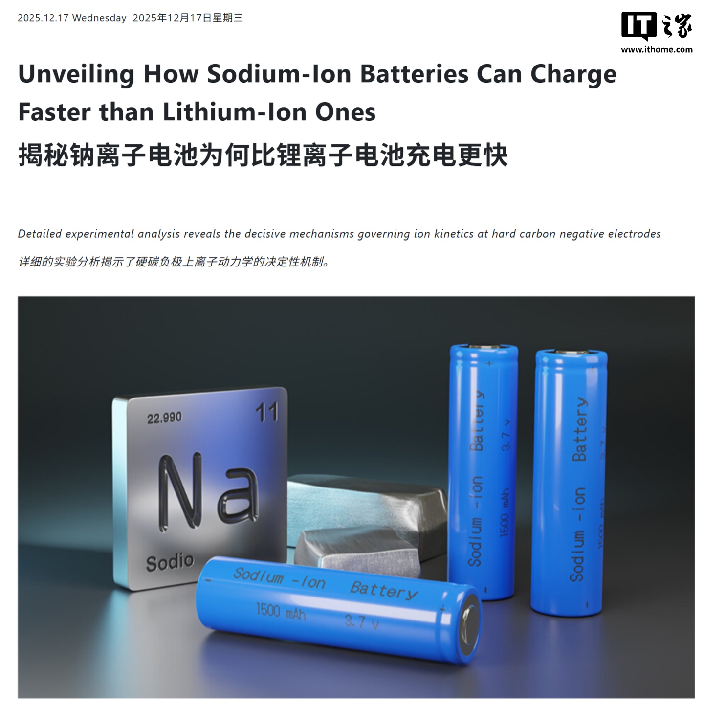 12 月 18 日消息,東京理科大學(TUS)昨日(12 月 17 日)發(fā)布博文,宣布其科研團隊證實,鈉離子電池(SIBs)在使用硬碳負極時,其充電速度在本質上可超越鋰離子電池(LIBs),有望成為智能手機電源的下一代解決方案。
