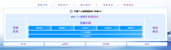 天禧AI由AUI、天禧大腦、天禧生態(tài)和可信安全平臺(tái)構(gòu)成,擁有感知、理解、記憶、規(guī)劃、調(diào)度五大能力。天禧AI 3.5實(shí)現(xiàn)了“三大飛躍”:首先是個(gè)性化飛躍,依托“全時(shí)空主動(dòng)記憶”技術(shù),結(jié)合全域知識(shí)庫(kù),生成因人而異的個(gè)性化答案;第二是行動(dòng)力飛躍,通過超級(jí)智能體工作群,實(shí)現(xiàn)多智能體協(xié)同,如AI播客、ChatExcel、超級(jí)互聯(lián)3.0都是其代表應(yīng)用;第三是交互體驗(yàn)飛躍,天禧AI 3.5具備多端協(xié)同感知,統(tǒng)一的AUI,讓用戶獲得始終如一的智能體驗(yàn)。