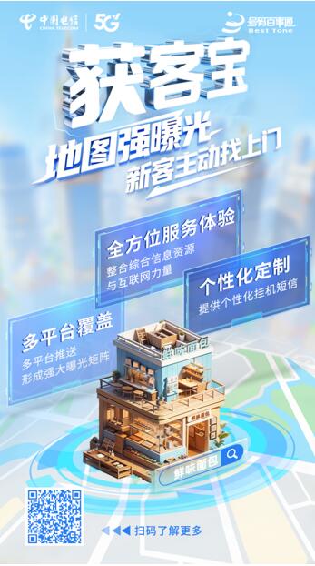 若說多平臺覆蓋是獲客寶的“廣度武器”,那一站式服務(wù)體驗便是其深耕商戶需求的“深度擔當”。中小商戶往往缺乏專業(yè)的營銷團隊,面對拉新、轉(zhuǎn)化、留存的全流程運營常感力不從心。而獲客寶整合中國電信的綜合信息資源與互聯(lián)網(wǎng)技術(shù)優(yōu)勢,將店鋪維系、圖片更新、視頻海報制作、商品活動推廣、掛機名片設(shè)置等功能融為一體,打造出“全鏈路智慧營銷生態(tài)”。