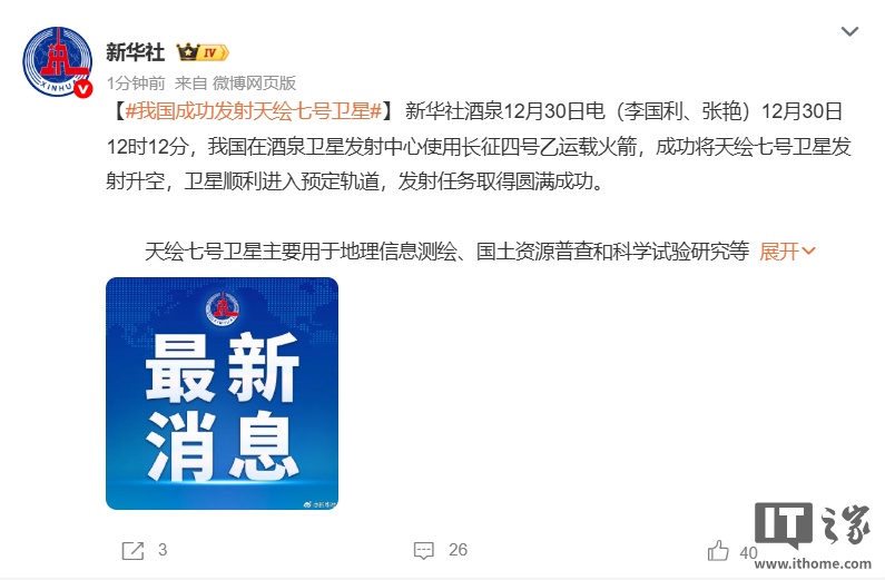 12 月 30 日消息,據(jù)新華社報道,12 月 30 日 12 時 12 分,我國在酒泉衛(wèi)星發(fā)射中心使用長征四號乙運載火箭,成功將天繪七號衛(wèi)星發(fā)射升空,衛(wèi)星順利進入預定軌道,發(fā)射任務取得圓滿成功。