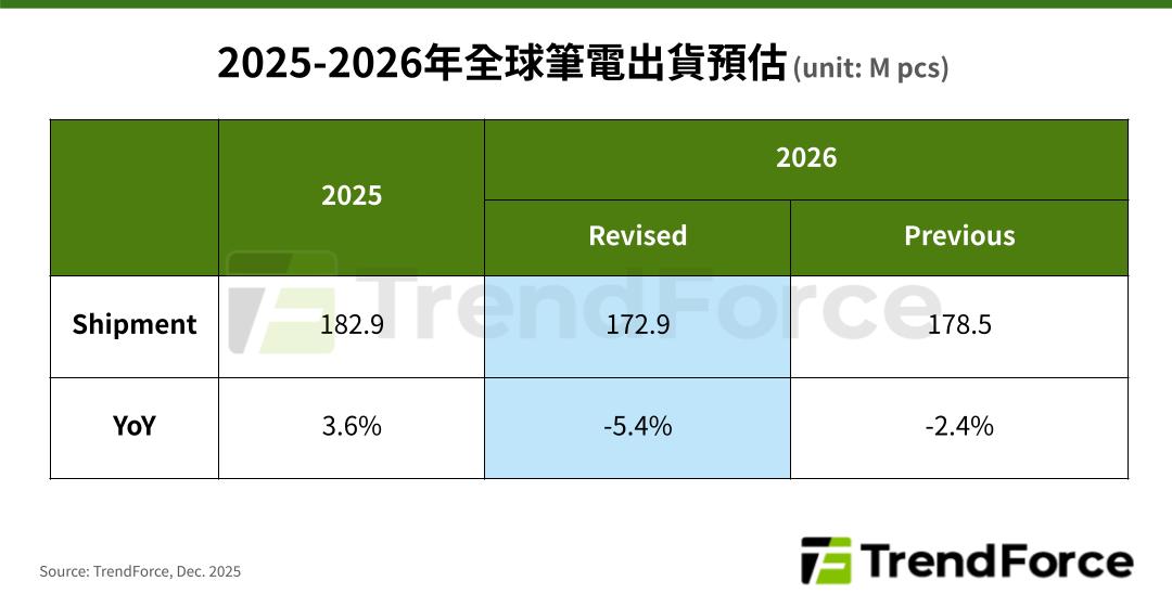 TrendForce 再度下調(diào) 2026 年全球筆記本電腦出貨預(yù)測(cè)至同比減少 5.4%