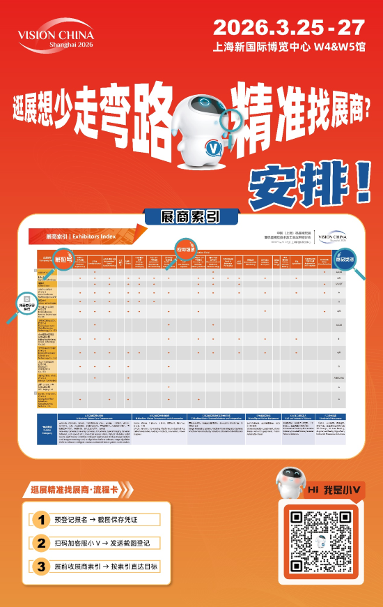 小V準(zhǔn)備了超實(shí)用的展商索引——清晰標(biāo)注各展商應(yīng)用領(lǐng)域與展品類別。讓您省去篩選麻煩,直奔目標(biāo)展臺(tái),F(xiàn)在完成預(yù)登記報(bào)名并添加客服小V,展前免費(fèi)發(fā)放這份實(shí)用指引,提前規(guī)劃行程、鎖定核心資源。早登記早省心,趕緊行動(dòng),解鎖這場(chǎng)機(jī)器視覺(jué)行業(yè)盛宴!