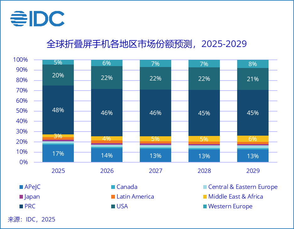 IDC 稱,自 2023 年起,中國正式超越其他市場,成為全球最大的折疊屏手機市場。依托成熟的本土供應(yīng)鏈體系、消費者對前沿科技的高接受度,以及廠商對用戶需求的精準(zhǔn)捕捉,中國在折疊屏手機的市場主導(dǎo)地位將長期穩(wěn)固,預(yù)計未來五年內(nèi),中國市場占全球折疊屏手機市場的比例將穩(wěn)定在 40% 以上,持續(xù)以創(chuàng)新引領(lǐng)推動全球折疊屏技術(shù)普及與產(chǎn)業(yè)升級。