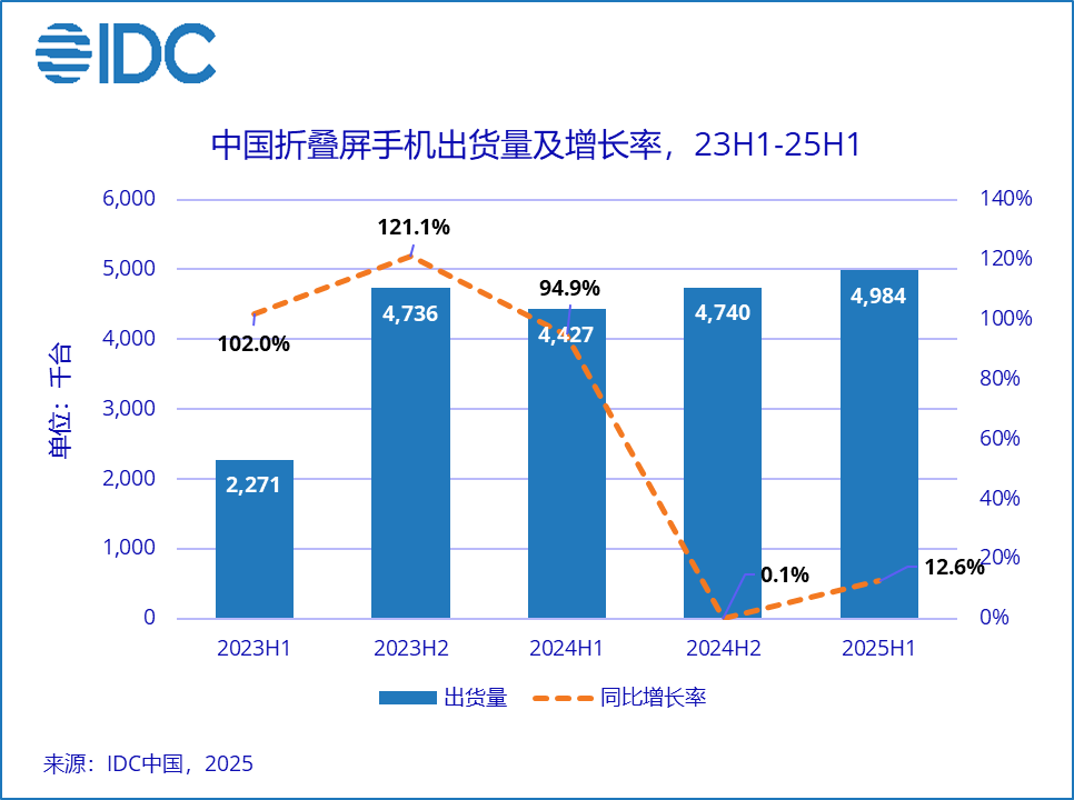 2025 上半年,中國折疊屏手機出貨量達到 498 萬臺,同比增長 12.6%。