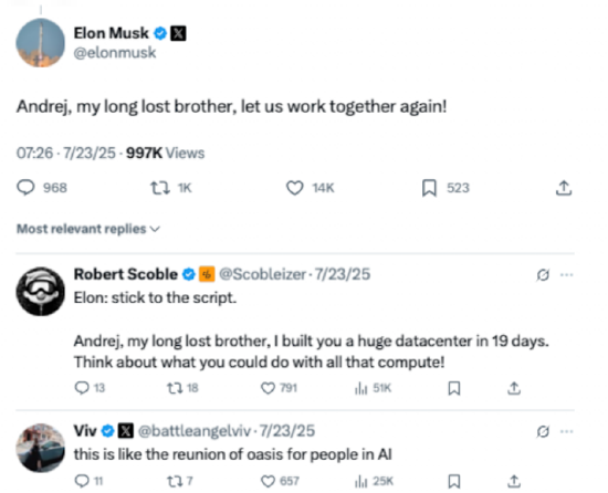 馬斯克對(duì)頂級(jí)人才有多謙遜?為了請(qǐng)?zhí)厮估癆utopilot業(yè)務(wù)負(fù)責(zé)人卡巴奇(Andej Karpathy)回來(lái),馬斯克甚至公開稱卡巴奇是“自己失散多年的兄弟”,懇請(qǐng)他回來(lái)和自己一道共事。這或許是他最謙卑主動(dòng)的一刻,僅次于對(duì)特朗普總統(tǒng)的“直男之愛”。