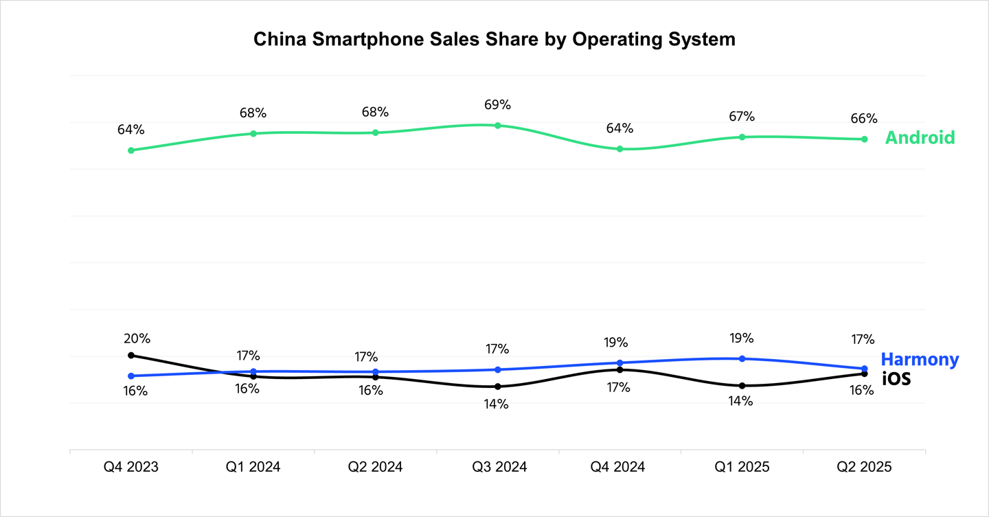 CounterPoint 報(bào)告中國手機(jī)系統(tǒng)份額:華為鴻蒙連續(xù) 6 個(gè)季度超蘋果 iOS 穩(wěn)居第二