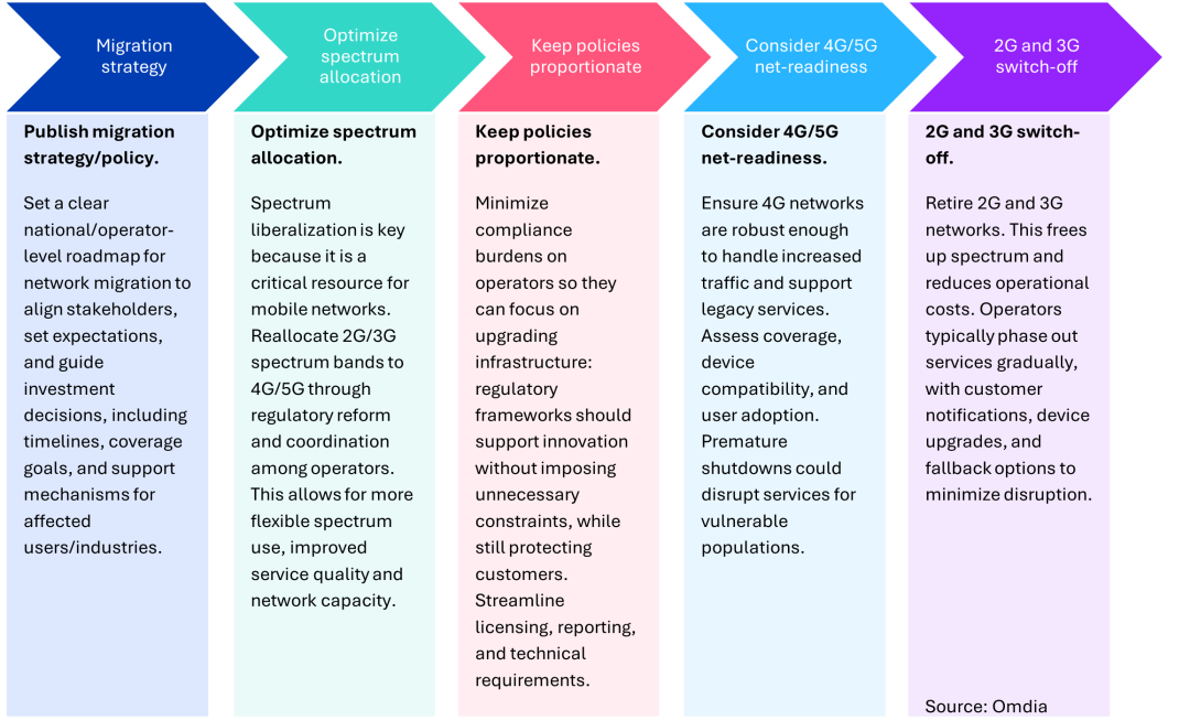 McBride指出:“隨著2G與3G加速退網(wǎng),消費者保護已成為監(jiān)管機構(gòu)的主要關(guān)注點。老年人、農(nóng)村人口、IoT用戶以及使用遺留設備的用戶面臨最大服務中斷風險。為此,監(jiān)管機構(gòu)開始要求實施清晰透明的溝通策略,包括退網(wǎng)時間表、替代服務方案、遷移計劃以及技術(shù)支持,以確保平穩(wěn)過渡!