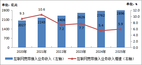 圖1-2  2020—2025年互聯(lián)網(wǎng)寬帶接入業(yè)務收入情況