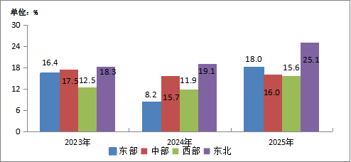 圖5-2  2023—2025年東、中、西、東北地區(qū)移動互聯(lián)網(wǎng)接入流量增速情況
