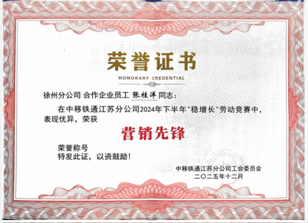近日,從省分公司傳來捷報:在江蘇鐵通2024年下半年“穩(wěn)增長”勞動競賽中,徐州分公司員工李永、戚建分別榮獲“裝維標兵”“工程先鋒”稱號。他們以卓越表現(xiàn)切實踐行了“淬鐵復(fù)興、創(chuàng)新向上”的企業(yè)精神,充分彰顯了“有旗必奪、有先必爭”的奮斗風貌。讓我們以他們?yōu)榘駱,見賢思齊、接續(xù)奮斗!