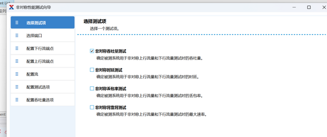 測試向?qū)峁┧念悳y試選項,本次重點(diǎn)選擇 “非對稱吞吐量測試”(測試結(jié)果將同步統(tǒng)計吞吐量、時延及抖動數(shù)據(jù)),其余選項可根據(jù)需求靈活勾選: