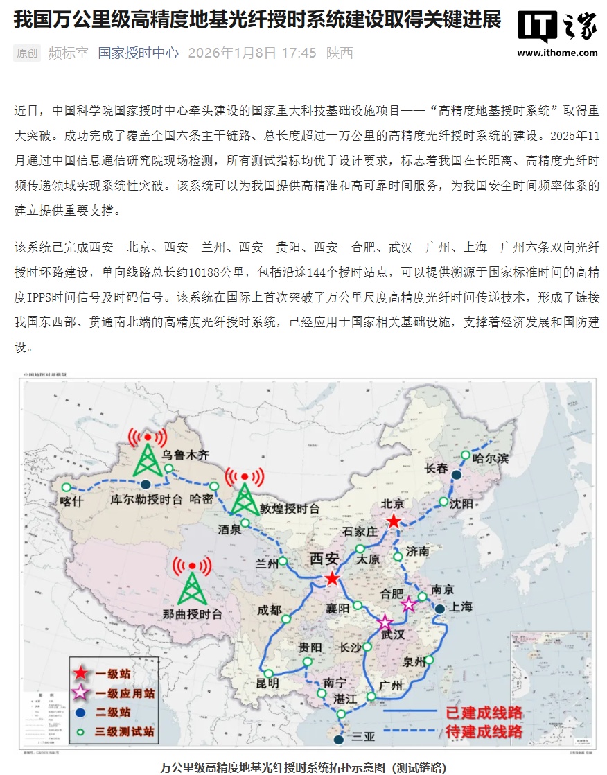 1 月 8 日消息,中國科學(xué)院國家授時中心今日官宣,國家重大科技基礎(chǔ)設(shè)施項目 ——“高精度地基授時系統(tǒng)”取得重大突破,成功完成了覆蓋全國六條主干鏈路、總長度超過一萬公里的高精度光纖授時系統(tǒng)的建設(shè)。