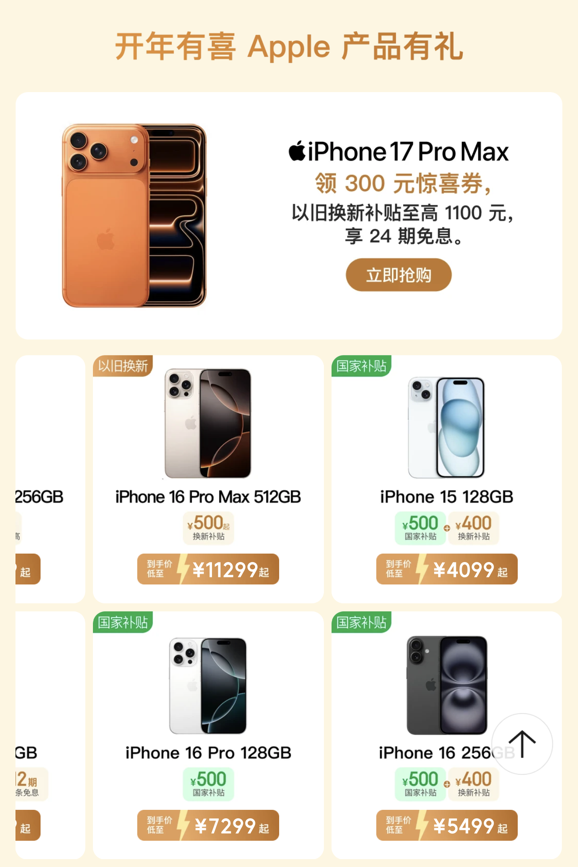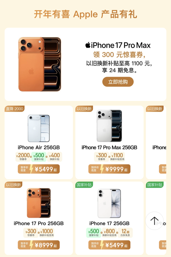 具體而言,iPhone 17系列可領(lǐng)500元國家補貼,加上至高800元的以舊換新補貼,256G版到手低至4699元起。iPhone 17 Pro系列可領(lǐng)300元驚喜券,可疊加1100元的以舊換新補貼,邀請好友可以多得100元以舊換新,至高優(yōu)惠1500元還支持12期免息,256G版到手低至7699元起;iPhone Air至高優(yōu)惠3400元,256G版到手低至4599元起,還可享12期免息福利。