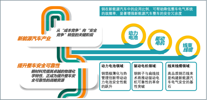 在新能源汽車產(chǎn)業(yè)從“成本競爭”向“安全競爭”轉(zhuǎn)型的關(guān)鍵階段,銅材料憑借其卓越的物理化學(xué)特性,正成為提升整車安全可靠性的戰(zhàn)略資源。國際銅業(yè)協(xié)會(ICA)的全球報告指出,銅在新能源汽車中的應(yīng)用比例,可幫助降低整車電氣系統(tǒng)的故障率,顯著增強新能源汽車整車的安全冗余度。