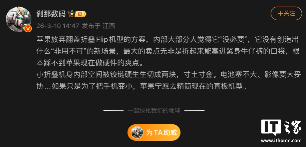 3 月 11 日消息,博主 @剎那數(shù)碼發(fā)文,透露蘋果放棄了翻蓋小折疊 Flip 機(jī)型的方案,這是因?yàn)閮?nèi)部大部分人覺得它“沒必要”,它沒有創(chuàng)造出什么“非用不可”的新場景,最大的賣點(diǎn)無非是折起來能塞進(jìn)緊身牛仔褲的口袋,“根本踩不到蘋果現(xiàn)在做硬件的爽點(diǎn)”。