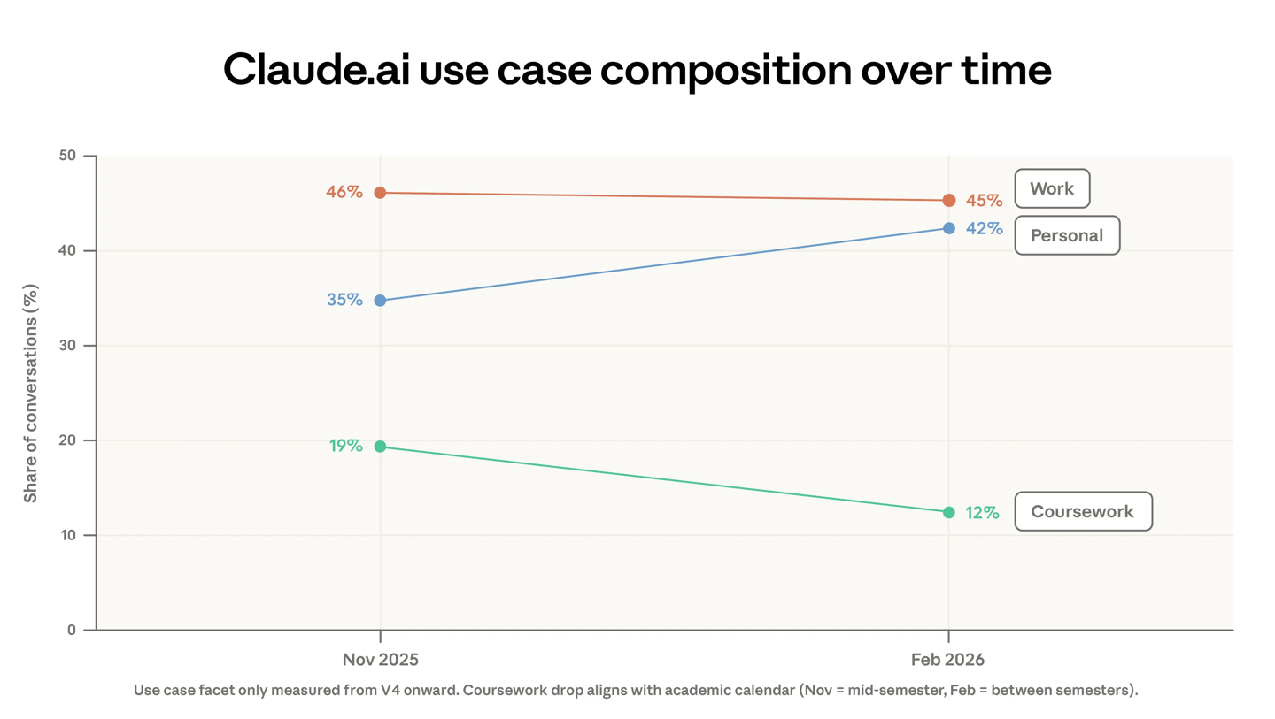 2025 年 11 月和 2026 年 2 月 Claude.ai 的工作、個(gè)人及課程使用情況。