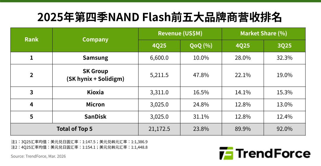 TrendForce:2025Q4 五大 NAND 閃存原廠相關(guān)營(yíng)收環(huán)比增長(zhǎng) 23.8%