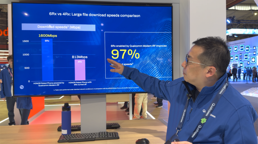高通展臺的演示專門挑選了幾個日常生活中常見的信號不佳環(huán)境進(jìn)行對比測試。相比傳統(tǒng)4Rx,開啟6Rx功能的同款機型,在封閉會議室場景下的文件下載測試中速率提升達(dá)97%;在走廊信號死角場景下總計180秒的測試時長中,觀看直播時的卡頓時長減少60%,卡頓率減少34.39%。