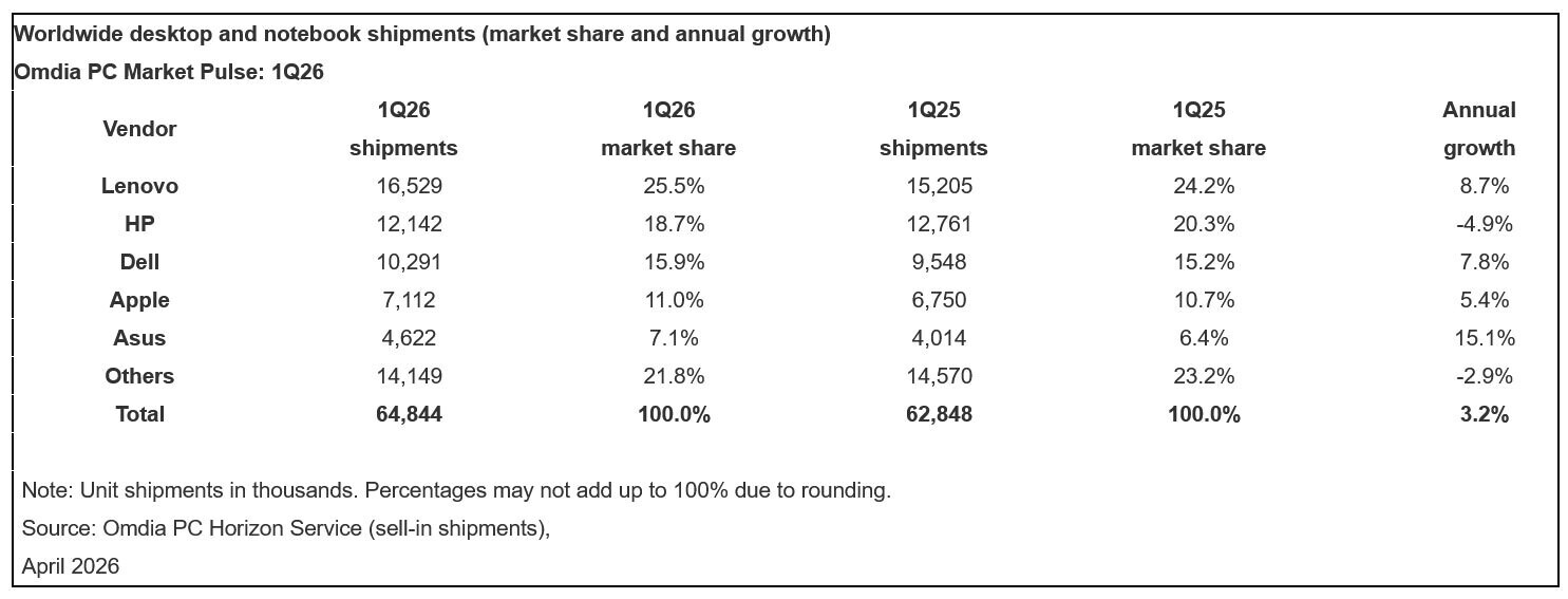 分廠商來看,聯(lián)想在 2026 年第一季度仍穩(wěn)居榜首,出貨量同比增長 8.7% 至 1650 萬臺,市場份額突破 25%;萜杖晕涣械诙,但由于在歐洲和美國市場表現(xiàn)疲軟,出貨量下滑 4.9% 至 1210 萬臺。戴爾延續(xù)了 2025 年第四季度的強(qiáng)勁勢頭,出貨量同比增長 7.8% 至 1030 萬臺。蘋果憑借 MacBook Air 的穩(wěn)健銷售表現(xiàn)以及 MacBook Neo 的初步鋪貨,出貨量增長 5.4%,市場份額達(dá)到 11%。華碩則保持了兩位數(shù)的出貨量增長,出貨量攀升至 460 萬臺,市場份額達(dá)到 7.1%。