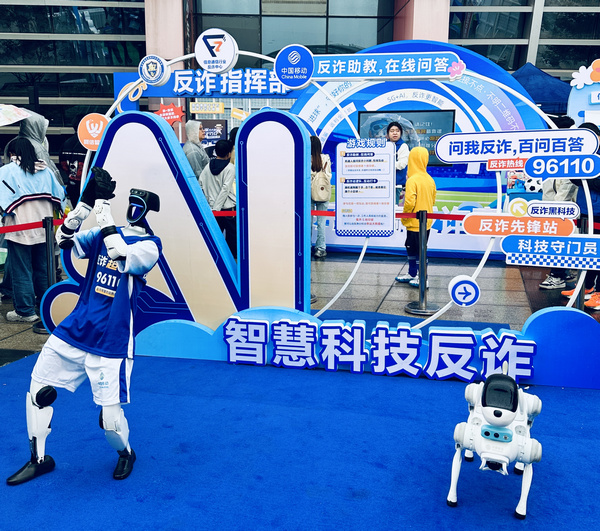 反詐宣傳活動(dòng)現(xiàn)場(chǎng),靈動(dòng)的機(jī)器狗在人群中穿梭,時(shí)而翻滾、時(shí)而作揖,引得孩子們爭(zhēng)相模仿,家長(zhǎng)們紛紛舉起手機(jī)拍照。一旁的反詐智能機(jī)器人則成了“主考官”,隨機(jī)從海量反詐題庫(kù)中抽題“拷問(wèn)”觀眾,還能實(shí)時(shí)識(shí)別語(yǔ)音答案、判斷對(duì)錯(cuò)!八写蛑畏道焯(hào)的兼職,全都是詐騙,對(duì)還是錯(cuò)?”機(jī)器人問(wèn)道。“對(duì)!”一位年輕球迷脫口而出!肮材,答對(duì)了!”工作人員隨即將這位幸運(yùn)球迷引導(dǎo)至抽獎(jiǎng)區(qū)試試手氣,引來(lái)一片歡呼。