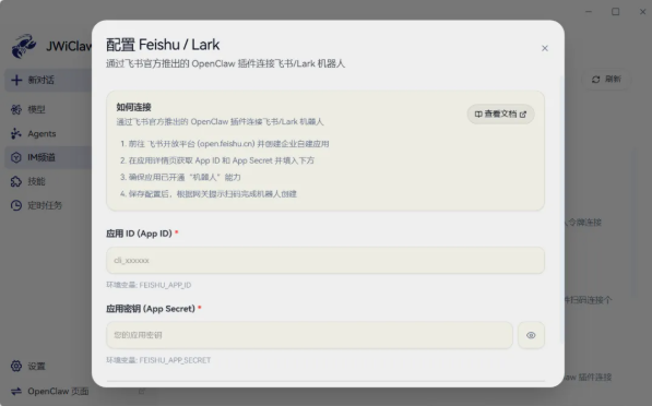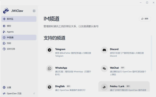 JWiClaw支持一鍵部署即時通訊頻道,用戶可通過圖形化界面快速接入主流IM工具,如微信、釘釘、飛書、WhatsApp等,實(shí)現(xiàn)與各平臺的機(jī)器人對接,大幅提升JWiClaw在多場景下的溝通效率與部署便捷性。