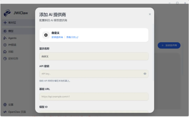 用戶可通過簡單配置 API 密鑰和基礎(chǔ) URL,快速接入本地模型和線上模型。相比原生OpenClaw,JWiClaw 將模型集成過程從命令行操作升級為可視化配置,極大提升部署效率與易用性,真正實(shí)現(xiàn)“按需選擇、簡單方便”的智能體構(gòu)建體驗。